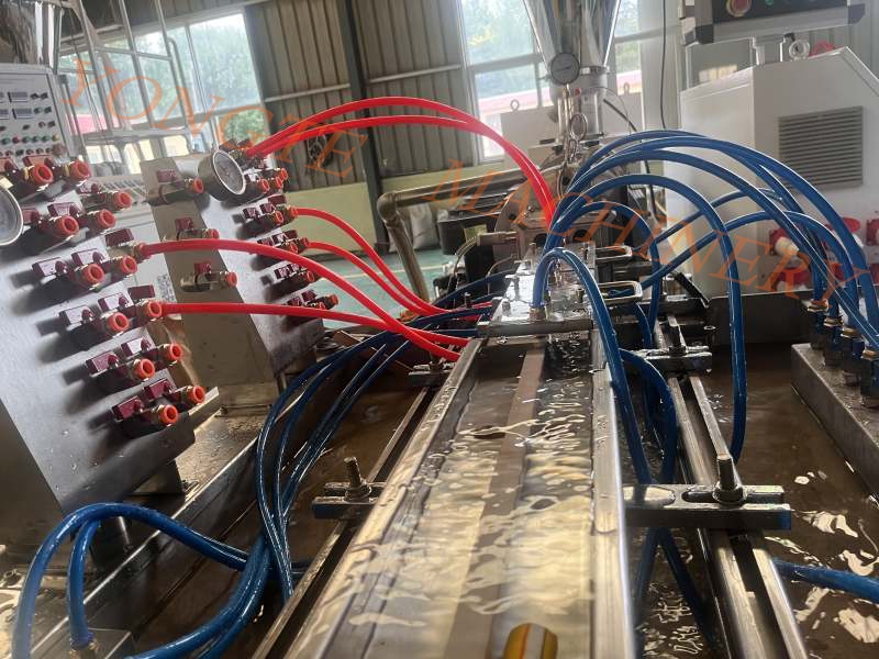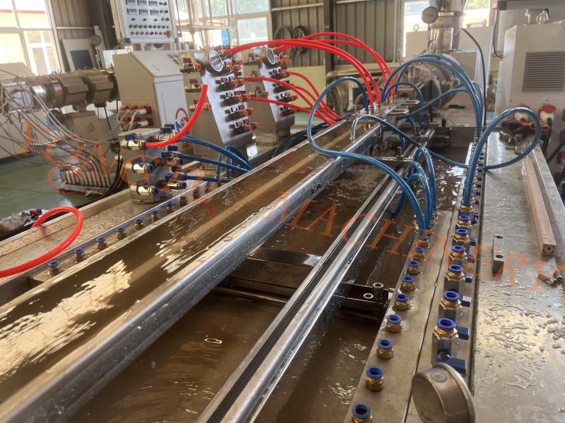 In risposta ai suddetti punti deboli del settore, i macchinari in plastica Yongte si basano sull'accumulo diAttrezzatura per estrusione del cavo in PVCRicerca e sviluppo per ottenere l'ottimizzazione dei processi a pieno processo attraverso le scoperte tecnologiche di base. In termini di sistema di estrusione, viene utilizzato un estruso a doppia vite con un rapporto lunghezza-diametro di 25: 1, con un rapporto di compressione di 2,5-3: 1 e dotato di un sistema di controllo della temperatura intelligente PID per controllare l'accuratezza del controllo della temperatura a ± 1 ° C, garantendo la plasticalizzazione uniforme del PVC ed evitare il rischio di interni di decomposizione; Lo spessore dello strato di placcatura cromata sulla superficie della vite è ≥20 μm e la canna è rivestita con lega di carburo di tungsteno per migliorare la corrosione e la resistenza all'usura dell'attrezzatura. Il sistema di stampo utilizza il software di analisi del flusso dello stampo per ottimizzare il canale di flusso per ottenere la deviazione dello spessore della parete del profilo entro ± 0,1 mm; Il corpo dello stampo è realizzato in acciaio inossidabile 4CR13 e integrato con il trattamento del rivestimento PVD ed è dotato di un sensore di pressione ad alta precisione per controllare la fluttuazione della pressione a ≤5%, estendendo efficacemente la durata di servizio dello stampo. La fase di raffreddamento e modellatura adotta una struttura di raffreddamento a tre livelli di raffreddamento, la pressione negativa della muffa a forma di vuoto viene mantenuta da -0,06 a -0,08mpa, la differenza di temperatura di raffreddamento dell'acqua di partizione del serbatoio di raffreddamento viene controllata a ≤3 ° C e il controllo preciso della temperatura viene utilizzato per evitare la deformazione del profilo. Inoltre, l'attrezzatura integra anche una serie di tecnologie intelligenti. Il meccanismo di trazione utilizza il servo azionamento per rendere la fluttuazione della tensione ≤1%, l'accuratezza del posizionamento del dispositivo di taglio CNC raggiunge ± 1 mm, la miscelazione e il sistema di essiccazione controlla il contenuto di umidità delle materie prime ≤0,03%e l'unità di trattamento della protezione ambientale raggiunge la velocità di rimozione di HCL ≥95%. Attraverso il sistema di controllo integrato PLC e la piattaforma di monitoraggio dei dati, si realizzano la regolazione in tempo reale e il monitoraggio dinamico dei parametri dell'intero processo di produzione.